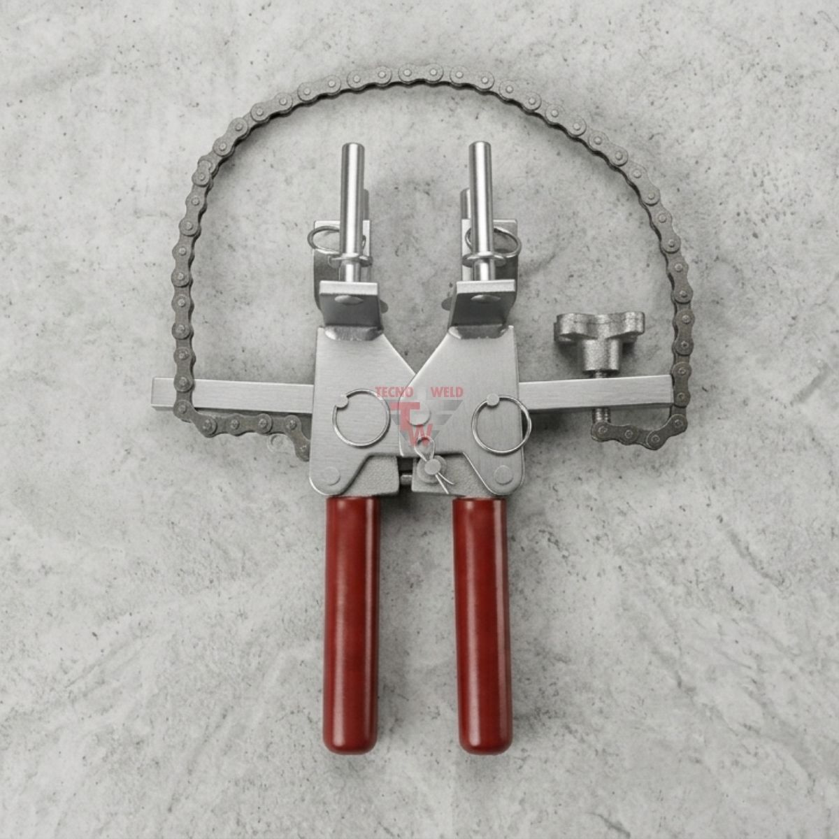 Cadenas para pinzas Tecnoweld diseñadas para fijar y sostener moldes sobre superficies en posición horizontal o vertical; aptas para moldes hasta 4″ de diámetro y con extensión para tuberías mayores.