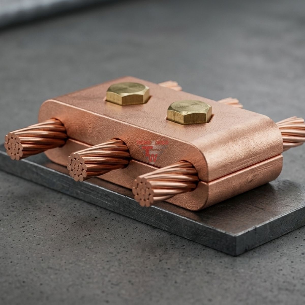 Los conectores TGE de Tecnoweld ofrecen un cubrimiento de cobre diseñado para garantizar una difusión uniforme de la corriente eléctrica, asegurando la continuidad y confiabilidad en sistemas eléctricos industriales.